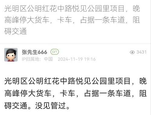 6. 帖文《光明区公明红花中路悦见公园里项目,晚高峰停大货车,卡车,占据一条车道,阻碍交通》