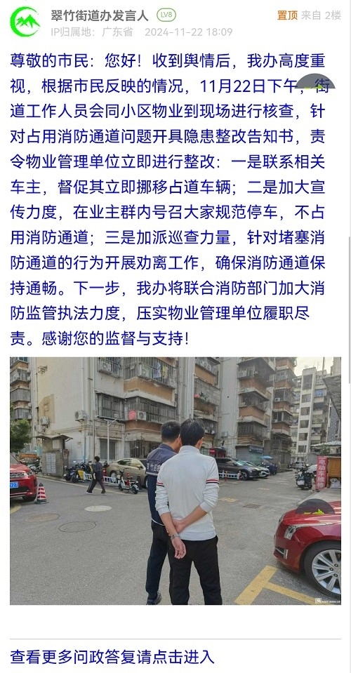 尊敬的市民:您好!收到舆情后,我办高度重视,根据市民反映的情况,11月22日下午,街道工作人员会同小区物业到现场进行核查,针对占用消防通道问题开具隐患整改告知书,责令物业管理单位立即进行整改:一是联系相关车主,督促其立即挪移占道车辆;二是加大宣传力度,在业主群内号召大家规范停车,不占用消防通道;三是加派巡查力量,针对堵塞消防通道的行为开展劝离工作,确保消防通道保持通畅。下一步,我办将联合消防部门加大消防监管执法力度,压实物业管理单位履职尽责。感谢您的监督与支持!