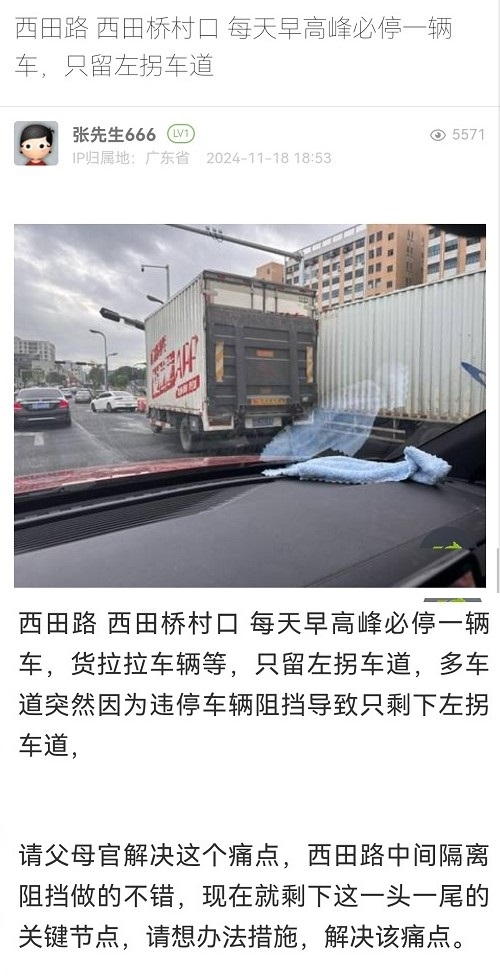 4. 帖文《西田路 西田桥村口 每天早高峰必停一辆车,只留左拐车道》