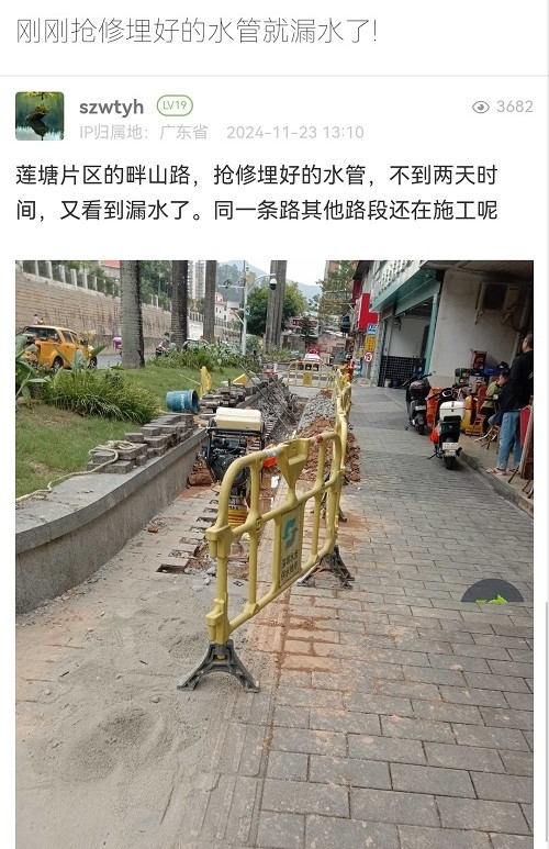 12. 帖文《刚刚抢修埋好的水管就漏水了!》