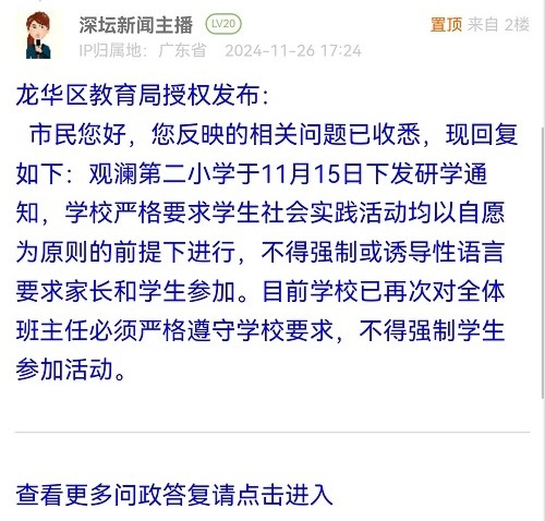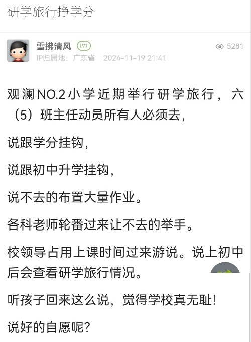 市民您好,您反映的相关问题已收悉,现回复如下:观澜第二小学于11月15日下发研学通知,学校严格要求学生社会实践活动均以自愿为原则的前提下进行,不得强制或诱导性语言要求家长和学生参加。目前学校已再次对全体班主任必须严格遵守学校要求,不得强制学生参加活动。