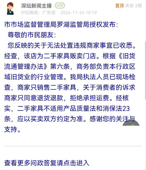 尊敬的市民朋友:您反映的关于无法处置违规商家事宜已收悉。经查,该店为二手家具贩卖门店。根据《旧货流通管理办法》第六条,商务部负责本行政区域旧货业的行业管理。我局执法人员已现场检查,商家只销售二手家具,关于消费者的诉求商家只同意退货退款,拒绝承担运费。经核实,二手家具不适用产品质量法和消保法23条,应以买卖双方约定为准。感谢您的关注与支持。