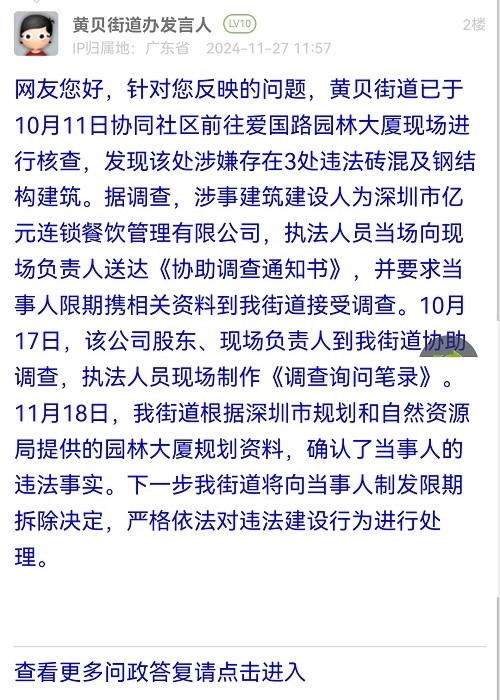 网友您好,针对您反映的问题,黄贝街道已于10月11日协同社区前往爱国路园林大厦现场进行核查,发现该处涉嫌存在3处违法砖混及钢结构建筑。据调查,涉事建筑建设人为深圳市亿元连锁餐饮管理有限公司,执法人员当场向现场负责人送达《协助调查通知书》,并要求当事人限期携相关资料到我街道接受调查。10月17日,该公司股东、现场负责人到我街道协助调查,执法人员现场制作《调查询问笔录》。11月18日,我街道根据深圳市规划和自然资源局提供的园林大厦规划资料,确认了当事人的违法事实。下一步我街道将向当事人制发限期拆除决定,严格依法对违法建设行为进行处理。