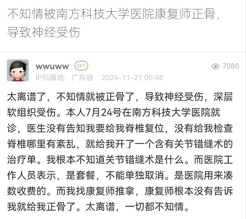 7. 帖文《不知情被南方科技大学医院康复师正骨,导致神经受伤》《为何对正骨的资质要求如此低?》