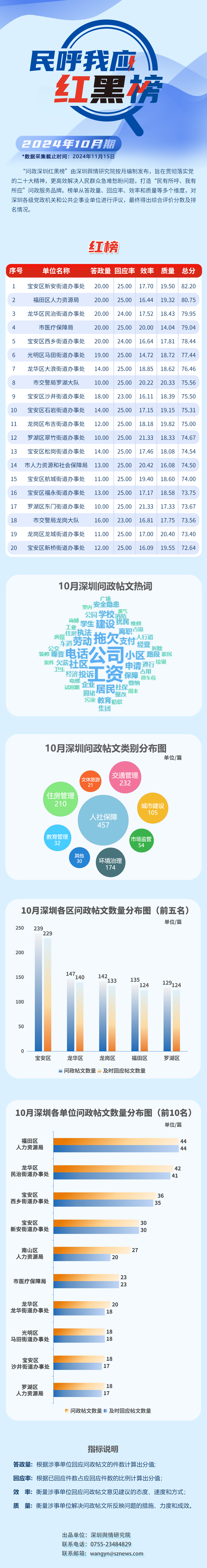 本期榜单采集的帖文主要来自深圳市及各区政府官网、深圳论坛、人民网领导留言板、深圳新闻网“民呼我应”等平台,所采集帖文发布时间为2024年10月1日至10月31日,采集截止时间为2024年11月15日。