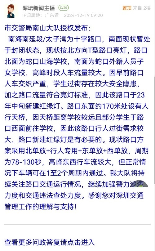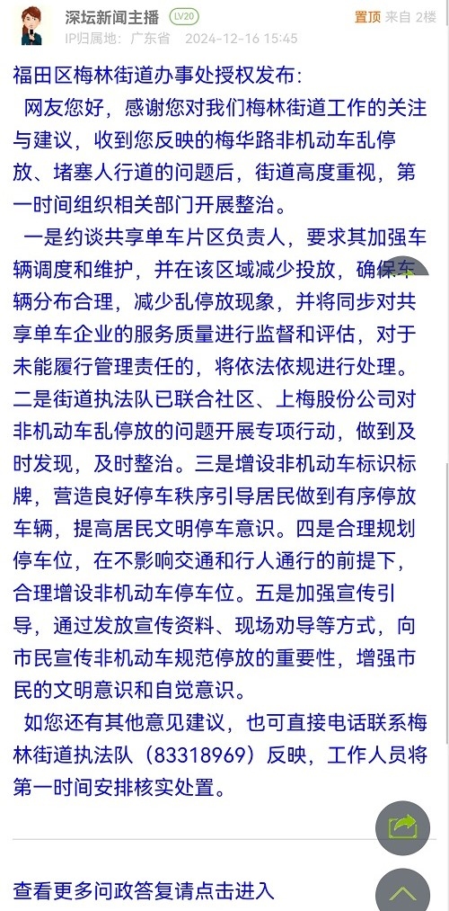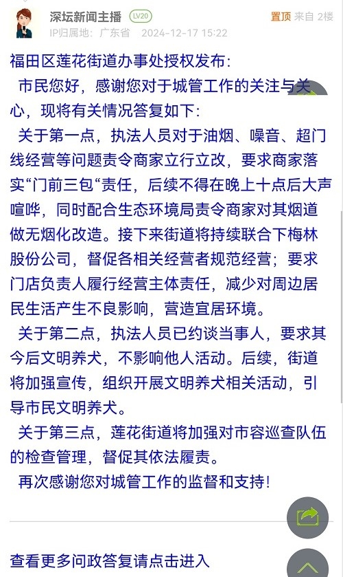 各职能单位如需对网友反映的问题进行回应,可在深圳论坛注册官方账号并通过认证,回帖进行回应。