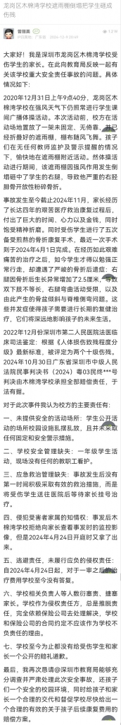 1. 帖文《龙岗区木棉湾学校遮雨棚倒塌把学生砸成伤残》