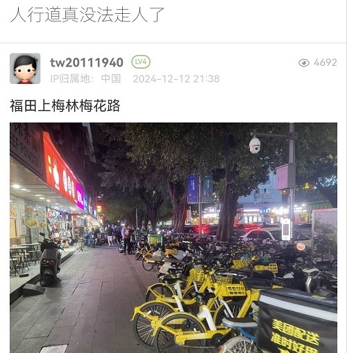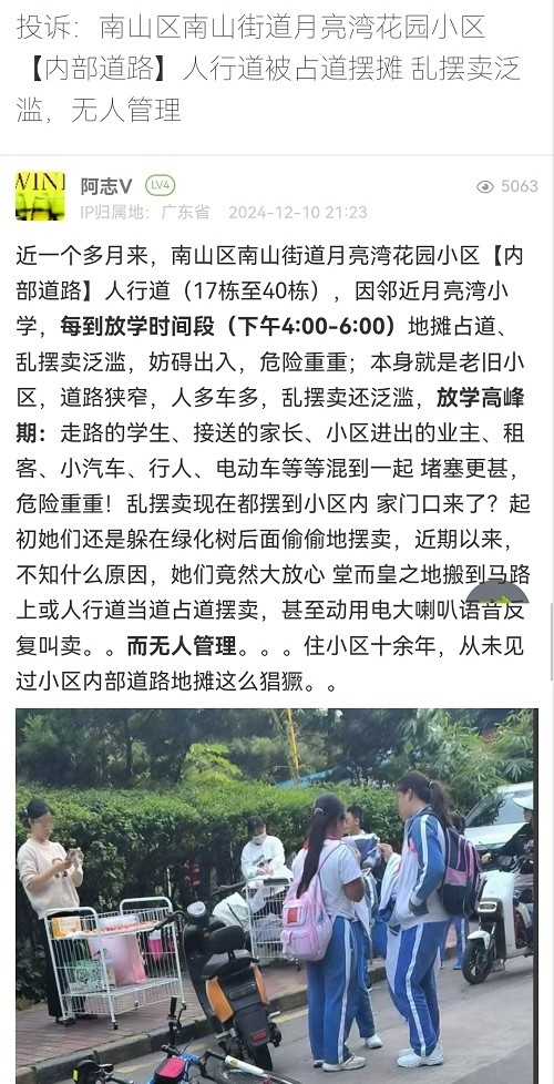 17. 帖文《投诉:南山区南山街道月亮湾花园小区【内部道路】人行道被占道摆摊 乱摆卖泛滥,无人管理》
