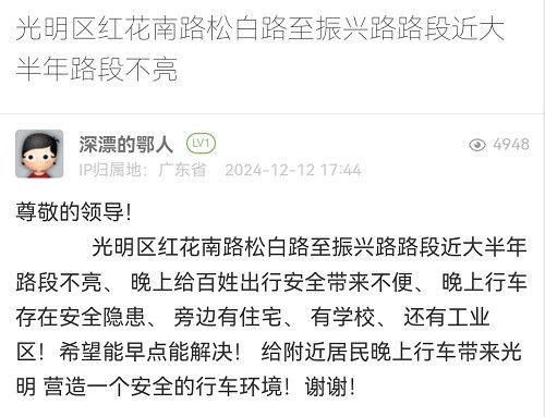 7. 帖文《光明区红花南路松白路至振兴路路段近大半年路段不亮》