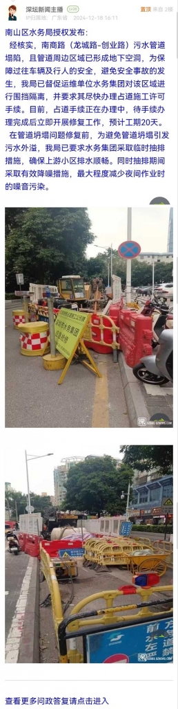 经核实,南商路(龙城路-创业路)污水管道塌陷,且管道周边区域已形成地下空洞,为保障过往车辆及行人的安全,避免安全事故的发生,我局已督促运维单位水务集团对该区域进行围挡隔离,并要求其尽快办理占道施工许可手续。目前,占道手续正在办理中,待手续办理完成后立即开展修复工作,预计工期20天。在管道坍塌问题修复前,为避免管道坍塌引发污水外溢,我局已要求水务集团采取临时抽排措施,确保上游小区排水顺畅。同时抽排期间采取有效降噪措施,最大程度减少夜间作业时的噪音污染。