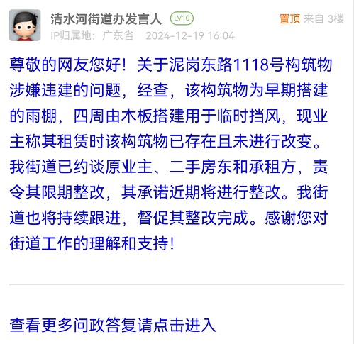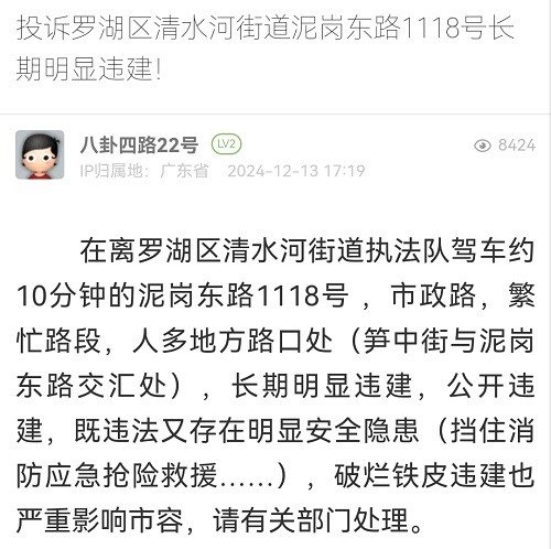 11. 帖文《投诉罗湖区清水河街道泥岗东路1118号长期明显违建!》