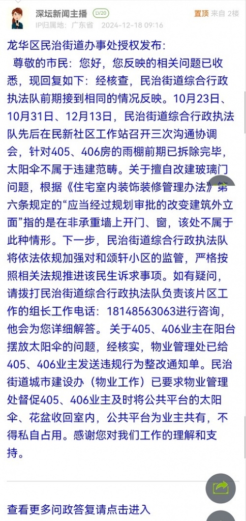 尊敬的市民:您好,您反映的相关问题已收悉,现回复如下:经核查,民治街道综合行政执法队前期接到相同的情况反映。10月23日、10月31日、12月13日,民治街道综合行政执法队先后在民新社区工作站召开三次沟通协调会,针对405、406房的雨棚前期已拆除完毕,太阳伞不属于违建范畴。关于擅自改建玻璃门问题,根据《住宅室内装饰装修管理办法》第六条规定的“应当经过规划审批的改变建筑外立面”指的是在非承重墙上开门、窗,该处不属于此种情形。下一步,民治街道综合行政执法队将依法依规加强对和颂轩小区的监管,严格按照相关法规推进该民生诉求事项。如有疑问,请拨打民治街道综合行政执法队负责该片区工作的组长工作电话:18148563063进行咨询,他会为您详细解答。 关于405、406业主在阳台摆放太阳伞的问题,经核实,物业管理处已给405、406业主发送违规行为整改通知单。民治街道城市建设办(物业工作)已要求物业管理处督促405、406业主及时将公共平台的太阳伞、花盆收回室内,公共平台为业主共有,不得私自占用。感谢您对我们工作的理解和支持。