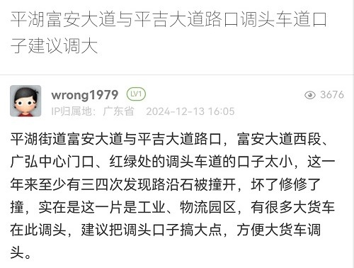 24. 帖文《平湖富安大道与平吉大道路口调头车道口子建议调大》
