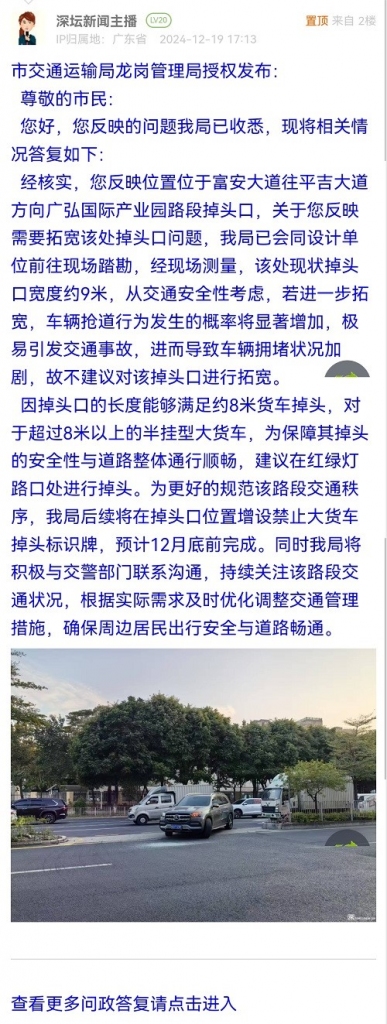 尊敬的市民:您好,您反映的问题我局已收悉,现将相关情况答复如下:经核实,您反映位置位于富安大道往平吉大道方向广弘国际产业园路段掉头口,关于您反映需要拓宽该处掉头口问题,我局已会同设计单位前往现场踏勘,经现场测量,该处现状掉头口宽度约9米,从交通安全性考虑,若进一步拓宽,车辆抢道行为发生的概率将显著增加,极易引发交通事故,进而导致车辆拥堵状况加剧,故不建议对该掉头口进行拓宽。因掉头口的长度能够满足约8米货车掉头,对于超过8米以上的半挂型大货车,为保障其掉头的安全性与道路整体通行顺畅,建议在红绿灯路口处进行掉头。为更好的规范该路段交通秩序,我局后续将在掉头口位置增设禁止大货车掉头标识牌,预计12月底前完成。同时我局将积极与交警部门联系沟通,持续关注该路段交通状况,根据实际需求及时优化调整交通管理措施,确保周边居民出行安全与道路畅通。