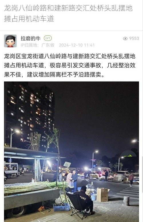 3. 帖文《龙岗八仙岭路和建新路交汇处桥头乱摆地摊占用机动车道》