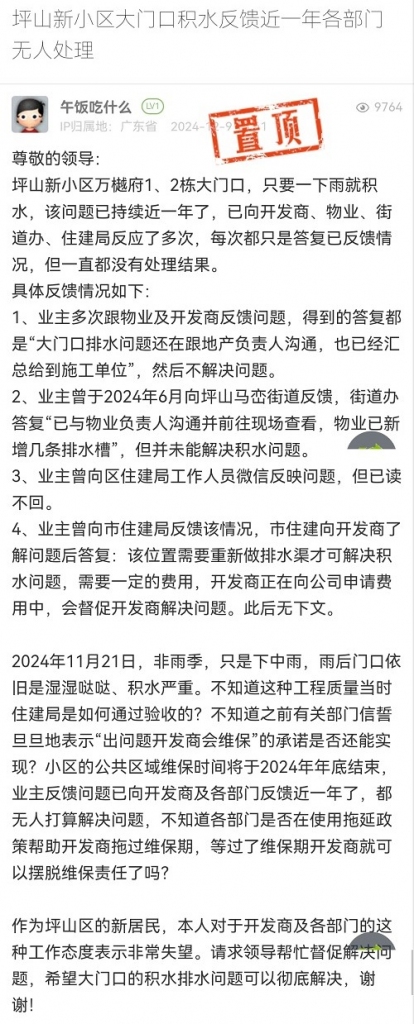 15. 帖文《坪山新小区大门口积水反馈近一年各部门无人处理》