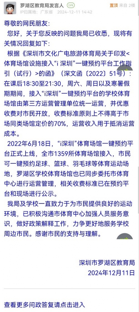 尊敬的网民朋友:您好,关于您反映的问题我局已收悉,现将有关情况回复如下:根据《深圳市文化广电旅游体育局关于印发<体育场馆设施接入“i 深圳”一键预约平台工作指引(试行)>的函》(深文函〔2022〕51号):在课后18:30至21:30,周六、周日以及寒暑假期期间,接入“i深圳”一键预约平台的学校体育场馆由第三方运营管理单位统一运营,并优惠收费对市民开放,收费标准原则上不得高于市场同类场馆定价的70%,运营收入用于抵消运营成本。2022年6月18日,“i深圳”体育场馆一键预约平台正式上线,全市1359所体育场馆接入,市民可一键预约足球、篮球、羽毛球等体育运动场地,罗湖区学校体育场馆也已同步委托市体育中心进行运营管理,相关收费标准已在预约平台和现场进行公示。我局及学校一直致力于为市民提供良好的运动环境,已积极沟通市体育中心加强人员服务意识,做好政策解释工作,力争更好地服务学校周边市民。感谢市民的支持与理解。