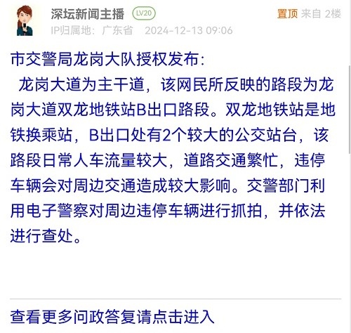 龙岗大道为主干道,该网民所反映的路段为龙岗大道双龙地铁站B出口路段。双龙地铁站是地铁换乘站,B出口处有2个较大的公交站台,该路段日常人车流量较大,道路交通繁忙,违停车辆会对周边交通造成较大影响。交警部门利用电子警察对周边违停车辆进行抓拍,并依法进行查处。