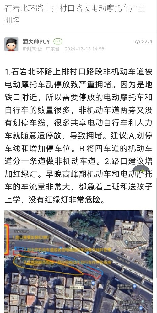 13. 帖文《石岩北环路上排村口路段电动摩托车严重拥堵》