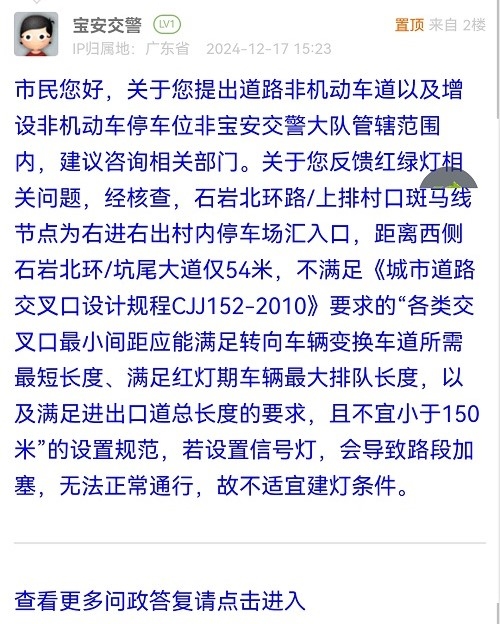 市民您好,关于您提出道路非机动车道以及增设非机动车停车位非宝安交警大队管辖范围内,建议咨询相关部门。关于您反馈红绿灯相关问题,经核查,石岩北环路/上排村口斑马线节点为右进右出村内停车场汇入口,距离西侧石岩北环/坑尾大道仅54米,不满足《城市道路交叉口设计规程CJJ152-2010》要求的“各类交叉口最小间距应能满足转向车辆变换车道所需最短长度、满足红灯期车辆最大排队长度,以及满足进出口道总长度的要求,且不宜小于150米”的设置规范,若设置信号灯,会导致路段加塞,无法正常通行,故不适宜建灯条件。