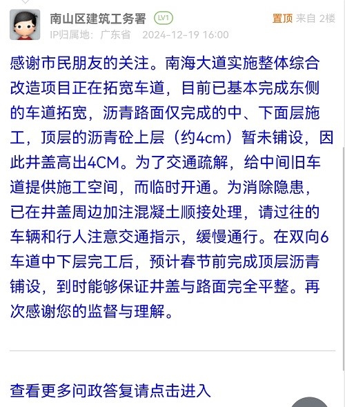 感谢市民朋友的关注。南海大道实施整体综合改造项目正在拓宽车道,目前已基本完成东侧的车道拓宽,沥青路面仅完成的中、下面层施工,顶层的沥青砼上层(约4cm)暂未铺设,因此井盖高出4CM。为了交通疏解,给中间旧车道提供施工空间,而临时开通。为消除隐患,已在井盖周边加注混凝土顺接处理,请过往的车辆和行人注意交通指示,缓慢通行。在双向6车道中下层完工后,预计春节前完成顶层沥青铺设,到时能够保证井盖与路面完全平整。再次感谢您的监督与理解。