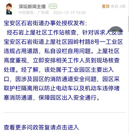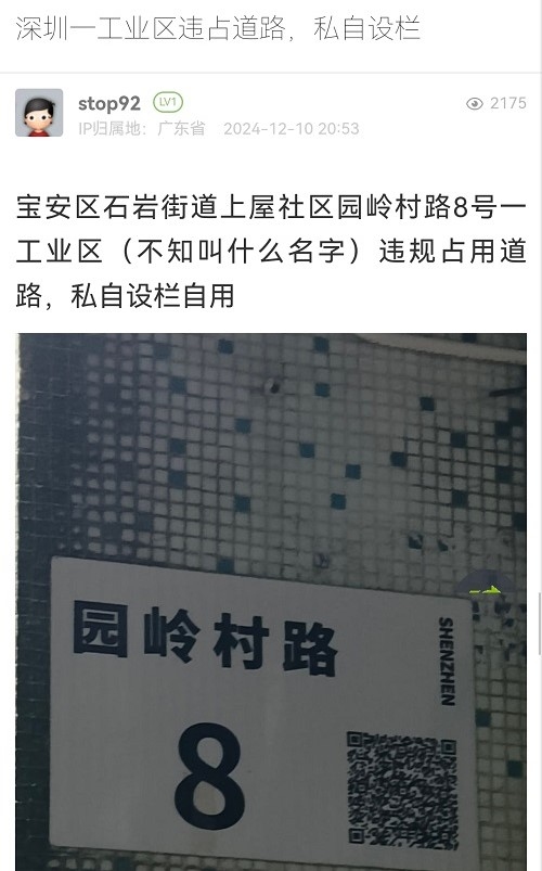 19. 帖文《深圳一工业区违占道路,私自设栏》