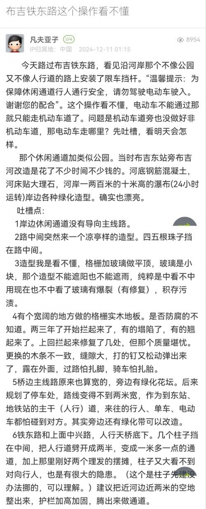 四、关于木质地板。格栅实木地板底部采用镀锌方通上搭实木地板,已采用防腐设计,原设计为人行通行使用,现因大量电单车涌入,造成格栅地板下部镀锌方通焊接点脱落及格栅地板破损。针对木板破损情况,我局已安排原施工单位开展修复,预计本月底完成修复工作。