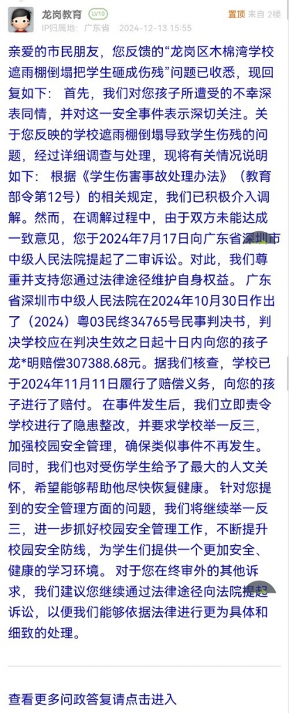 亲爱的市民朋友,您反馈的“龙岗区木棉湾学校遮雨棚倒塌把学生砸成伤残”问题已收悉,现回复如下: 首先,我们对您孩子所遭受的不幸深表同情,并对这一安全事件表示深切关注。关于您反映的学校遮雨棚倒塌导致学生伤残的问题,经过详细调查与处理,现将有关情况说明如下: 根据《学生伤害事故处理办法》(教育部令第12号)的相关规定,我们已积极介入调解。然而,在调解过程中,由于双方未能达成一致意见,您于2024年7月17日向广东省深圳市中级人民法院提起了二审诉讼。对此,我们尊重并支持您通过法律途径维护自身权益。 广东省深圳市中级人民法院在2024年10月30日作出了(2024)粤03民终34765号民事判决书,判决学校应在判决生效之日起十日内向您的孩子龙*明赔偿307388.68元。据我们核查,学校已于2024年11月11日履行了赔偿义务,向您的孩子进行了赔付。 在事件发生后,我们立即责令学校进行了隐患整改,并要求学校举一反三,加强校园安全管理,确保类似事件不再发生。同时,我们也对受伤学生给予了最大的人文关怀,希望能够帮助他尽快恢复健康。 针对您提到的安全管理方面的问题,我们将继续举一反三,进一步抓好校园安全管理工作,不断提升校园安全防线,为学生们提供一个更加安全、健康的学习环境。 对于您在终审外的其他诉求,我们建议您继续通过法律途径向法院提起诉讼,以便我们能够依据法律进行更为具体和细致的处理。