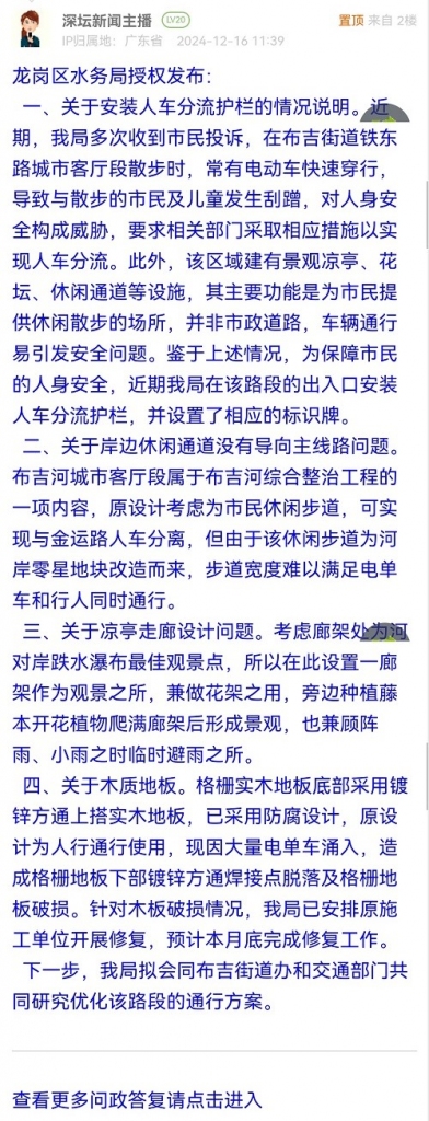 一、关于安装人车分流护栏的情况说明。近期,我局多次收到市民投诉,在布吉街道铁东路城市客厅段散步时,常有电动车快速穿行,导致与散步的市民及儿童发生刮蹭,对人身安全构成威胁,要求相关部门采取相应措施以实现人车分流。此外,该区域建有景观凉亭、花坛、休闲通道等设施,其主要功能是为市民提供休闲散步的场所,并非市政道路,车辆通行易引发安全问题。鉴于上述情况,为保障市民的人身安全,近期我局在该路段的出入口安装人车分流护栏,并设置了相应的标识牌。