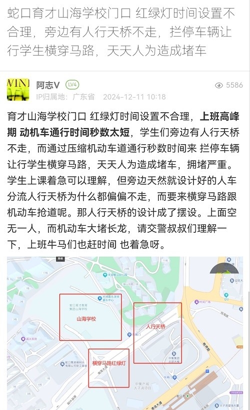 20. 帖文《蛇口育才山海学校门口 红绿灯时间设置不合理,旁边有人行天桥不走,拦停车辆让行学生横穿马路,天天人为造成堵车》