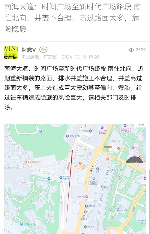 23. 帖文《南海大道:时间广场至新时代广场路段 南往北向,井盖不合理,高过路面太多,危险隐患》