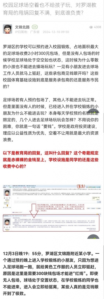 2. 帖文《校园足球场空着也不给孩子玩,对罗湖教育局的甩锅回复不满,到底谁负责?》