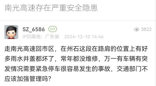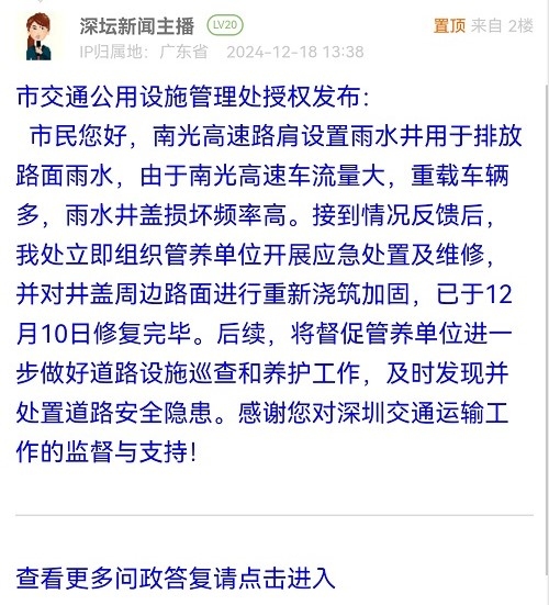 市民您好,南光高速路肩设置雨水井用于排放路面雨水,由于南光高速车流量大,重载车辆多,雨水井盖损坏频率高。接到情况反馈后,我处立即组织管养单位开展应急处置及维修,并对井盖周边路面进行重新浇筑加固,已于12月10日修复完毕。后续,将督促管养单位进一步做好道路设施巡查和养护工作,及时发现并处置道路安全隐患。感谢您对深圳交通运输工作的监督与支持!