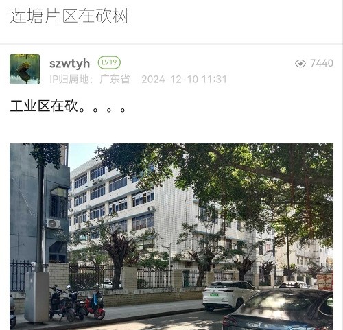 尊敬的网友您好!你反映的情况已收悉。经核查,因为第一工业园区内的树木久未修剪,树枝生长繁茂,在台风天气容易出现吹断砸到行人及车辆的情况,另外有部分枝干挡住了监控,给治安防范带来一定阻碍,因此园区管理处对园区内的树木进行了修剪。接到相关投诉后,我街道立即派执法队员前往第一工业区检查,发现存在过度修剪城市树木的情况,执法员立即进行了现场勘验,2024年12月13日,我街道执法员通知园区管理处到我街道执法队接受调查处理。我街道已按照相关法定程序对园区管理处修树状况进行调查询问,园区管理处不按照技术规范修剪树木的行为违反了《深圳经济特区绿化条例》第四十条第二款的规定,依据《深圳经济特区绿化条例》第六十六条第二款规定,我街道执法队对园区管理处作出行政处罚决定,处以人民币1000元罚款的行政处罚。目前该物业已缴纳罚款。后续我街道将继续加强绿化管理,坚决打击过度修剪,乃至乱砍乱伐等违法行为。感谢您对我街道工作的监督与支持!
