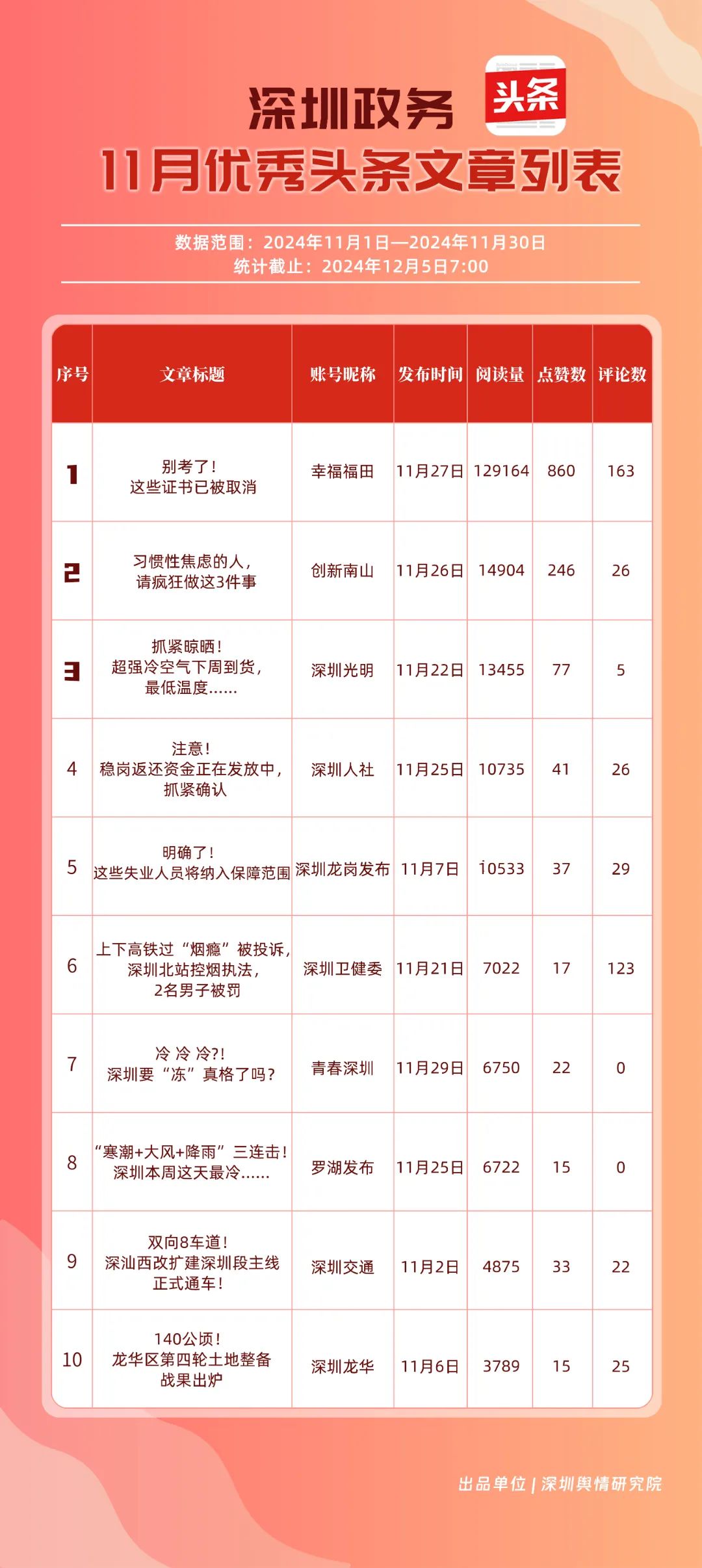 11月,“幸福福田”“深圳龙岗发布”“创新南山”“深圳人社”“深圳龙华”“深圳光明”“滨海宝安”“坪山发布”“深圳卫健委”“罗湖发布”共10个政务头条号入选“优秀政务头条号”榜单。“幸福福田”发布大量民生相关信息,稳居第一。“深圳龙岗发布”同样表现不凡,排名始终位于前列,展现了其在信息传播与政务服务方面的卓越能力。此外,账号“创新南山”“深圳人社”“深圳龙华”“深圳光明”在榜单中的排名有所提升,为政务新媒体树立了典范。