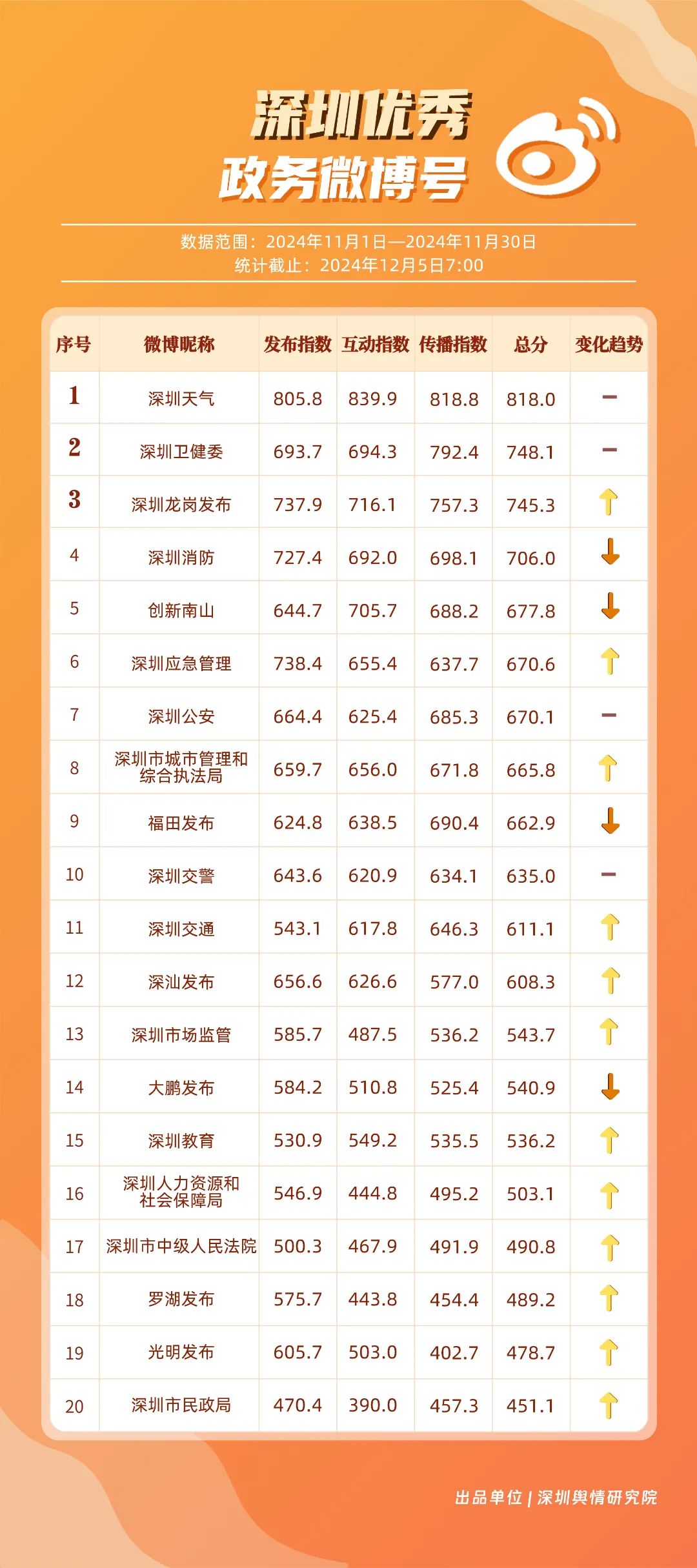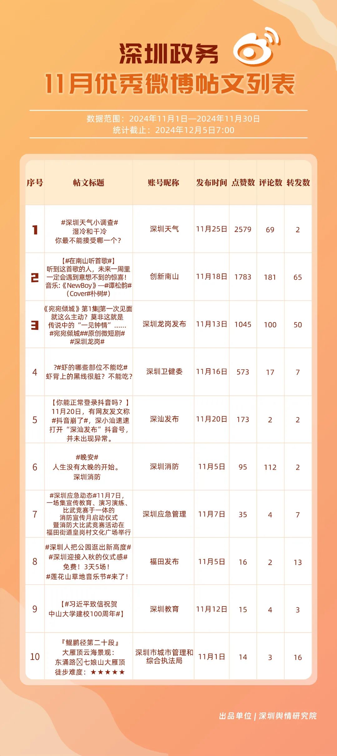 11月,“深圳天气”“深圳卫健委”“深圳龙岗发布”“深圳消防”“创新南山”“深圳应急管理”“深圳公安”“深圳市城市管理和综合执法局”“福田发布”“深圳交警”等20个账号入选“优秀政务微博号”。“深圳天气”“深圳卫健委”账号在信息传播上不断精进,为市民带来及时、优质且高效的资讯,内容紧贴民生,赢得了市民的广泛赞誉,排名稳定在前2名。同时,“深圳龙岗发布”“深圳消防”和“创新南山”等账号也能够精准满足市民的信息需求,并在此基础上提升市民阅读体验,推动了其在榜单上的稳步提升,彰显了政务微博的创新活力与社会价值。