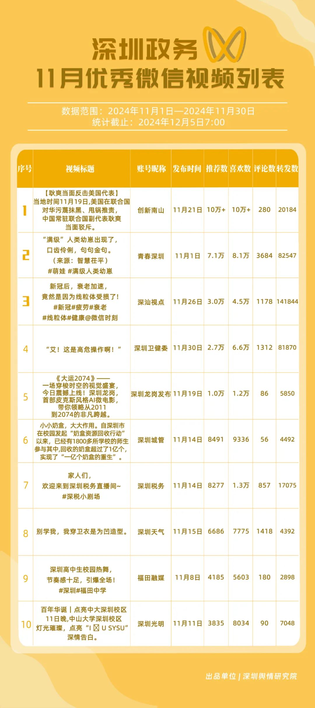 11月,获“深圳优秀政务微信视频号”称号的分别是“深汕视点”“青春深圳”“深圳卫健委”“创新南山”“深圳龙岗发布”“福田融媒”“深圳教育”“深圳天气”“深圳税务”“深圳光明”。其中,“深汕视点”与“青春深圳”通过积极转发涵盖广泛领域的优质视频内容,赢得了网民的广泛点赞与推荐,彰显了其在内容聚合与传播上的独到之处。“深圳卫健委”则专注于卫生健康领域,发布了一系列高质量的内容,深受网民喜爱,进一步巩固了其在健康传播领域的领先地位。
