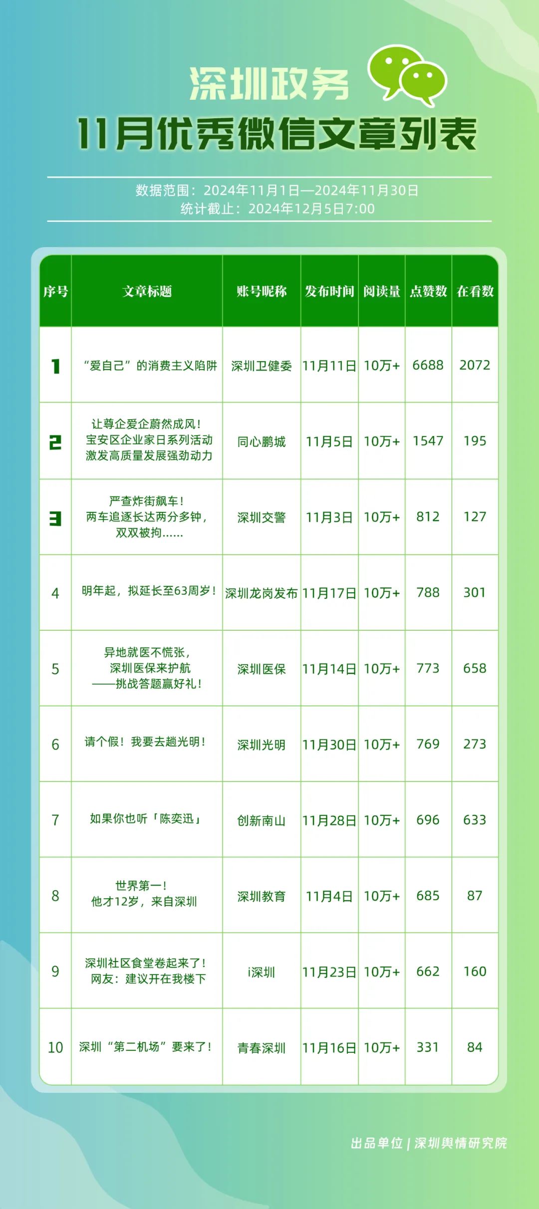 11月,“深圳卫健委”“深圳龙岗发布”“幸福福田”“i深圳”“创新南山”“青春深圳”“深圳光明”“深圳工会”“深圳教育”“深圳龙华”等30个账号入选“深圳优秀政务微信公众号”。其中,“深圳卫健委”以802.2分位于榜单首位,“深圳龙岗发布”“幸福福田”“i深圳”排名保持靠前。“创新南山”“深圳光明”则凭借内容质量、创新性的提升,展现了政务宣传的新活力,排名有所提升。