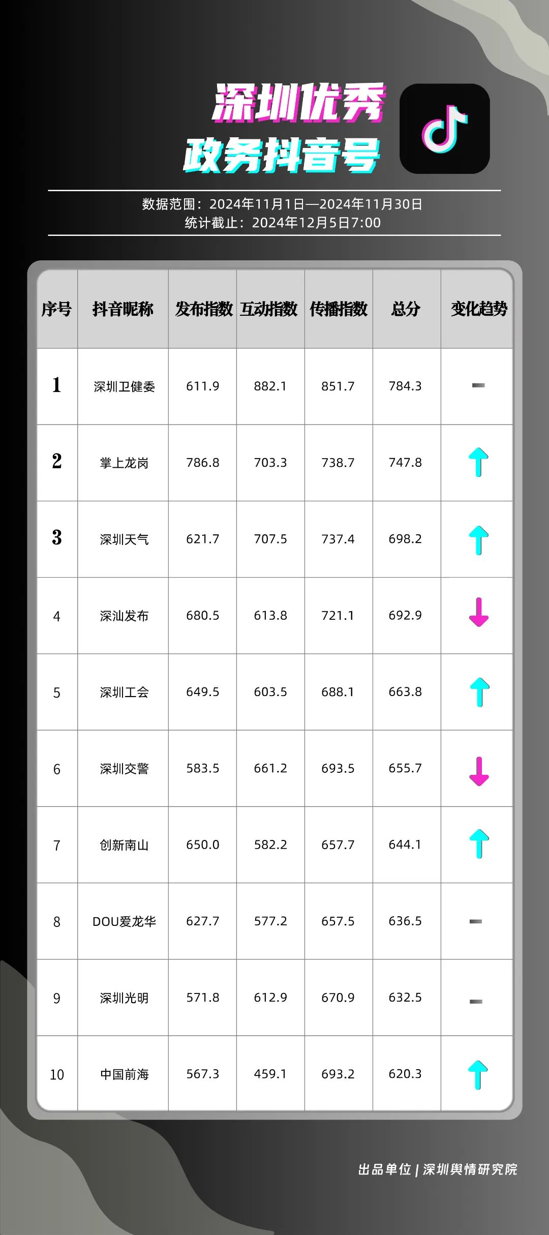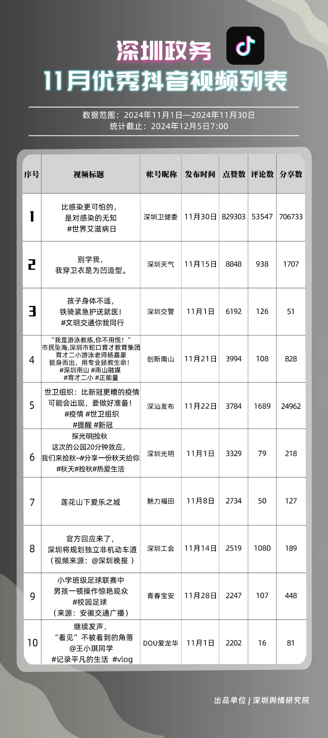 11月,“深圳卫健委”“掌上龙岗”“深圳天气”“深汕发布”“深圳工会”“深圳交警”“创新南山”“DOU爱龙华”“深圳光明”“中国前海”共10个政务抖音号获得“深圳优秀政务抖音号”称号。“深圳卫健委”凭借高质量剧情内容,巧妙融入健康知识,视频累计收获近百万点赞。同时,“掌上龙岗”和“深圳天气”也在视频内容创新上不断探索,通过优化宣传策略和信息传播方式,使得网民能够在轻松愉快的氛围中了解龙岗区的最新动态和深圳的天气信息,展现了政务抖音号的独特魅力与社会影响力。