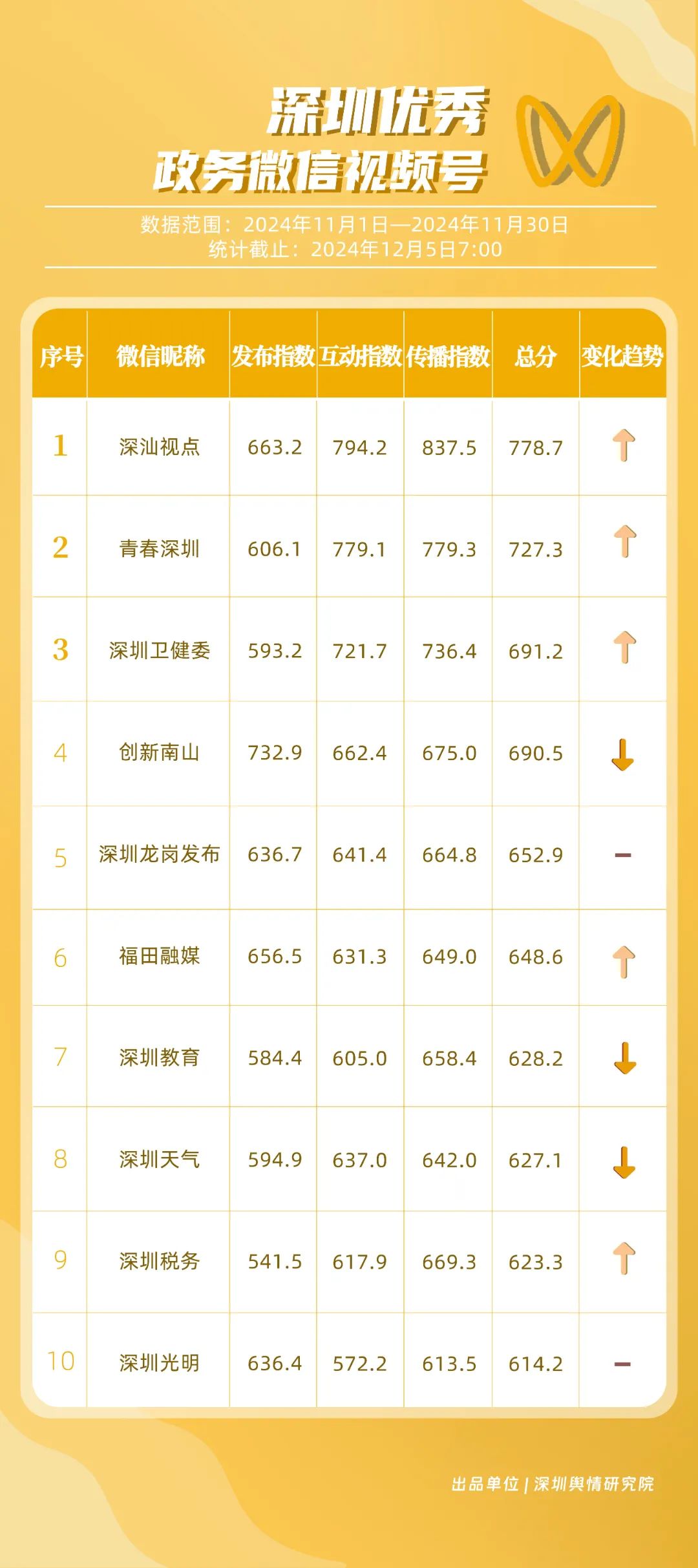 《深圳优秀政务新媒体矩阵》将深圳党政机关、企事业单位开设的政务公众号(微信)、微博号、抖音号、视频号(微信)及头条号按照发布指数、互动指数、传播指数三项指标进行综合评价,最终形成优秀名单。