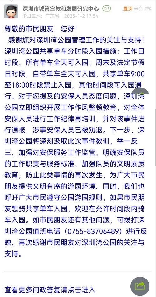 感谢您对深圳湾公园管理工作的关注与支持!深圳湾公园共享单车分时段入园措施:工作日时段,所有单车全天可入园;周末及法定节假日时段,自带单车全天可入园,共享单车9:00至18:00时段禁止入园,其他时间段可入园通行。对于您提及的安保人员态度问题,深圳湾公园立即组织开展工作作风整顿教育,对全体安保人员进行工作纪律再培训,并对该事件进行通报,涉事安保人员已被劝退。下一步,深圳湾公园将深刻汲取此次事件教训,举一反三,加强对安保服务工作监管,明确安保队员的工作职责与服务标准,加强队员的文明素质教育,防止此类事情的再次发生,为广大市民朋友提供文明有序的游园环境。同时,我们也呼吁广大市民遵守公园游园规则,如果市民朋友想骑共享单车入园,欢迎在允许时间段内骑车入园。如市民朋友还有其他问题,可拨打深圳湾公园值班电话(0755-83706489)进行反映,再次感谢市民朋友对深圳湾公园的关注与支持。