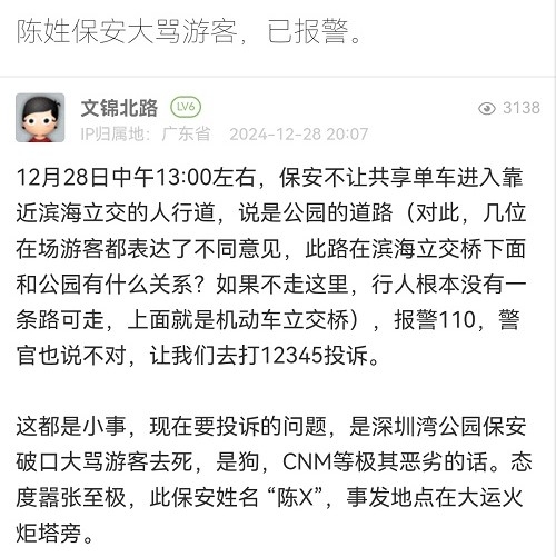 22. 帖文《陈姓保安大骂游客,已报警。》