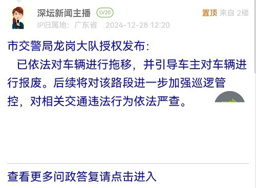 已依法对车辆进行拖移,并引导车主对车辆进行报废。后续将对该路段进一步加强巡逻管控,对相关交通违法行为依法严查。
