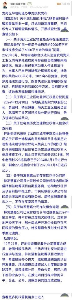 2024年12月10日,坪地街道组织六联股份公司、老围村、特发慧嘉、海天工业区相关负责人,就海天工业区拆迁权益分配进行商议,各方现场已达成共识。