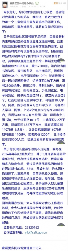 关于您反映儿童游乐设施不足问题,我办在2024年年初已重点关注,并于3月开展实施园岭童乐计划,我办经过前期踩点选址、民意征集和多方协商会后,通过采纳居民意见因地制宜在园岭新村83栋、87栋、园岭七街、怡水园处均新建了儿童游乐园,目前均已投入使用。建议居民可移步至上步绿廊公园、爱学园、岩生园以及这四处公园游玩。关于园岭大型儿童游乐设施的建设,后续我办也将在2025年征集周边居民的意见后,再寻找适宜的空地进行合理建设。园岭街道办欢迎广大人民群众对我办工作进行监督,也会认真处理群众所反映问题,若对我街道的工作和处理结果不满意,请依法依规向政府部门反应,园岭街道办网站有监督电话和邮箱: