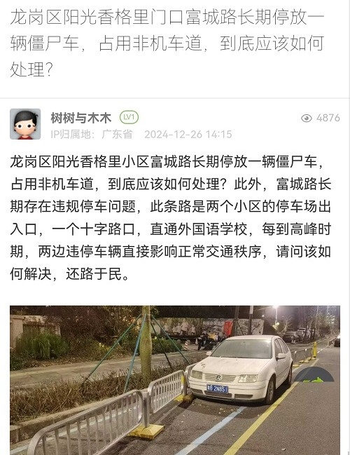 13. 帖文《龙岗区阳光香格里门口富城路长期停放一辆僵尸车,占用非机车道,到底应该如何处理?》