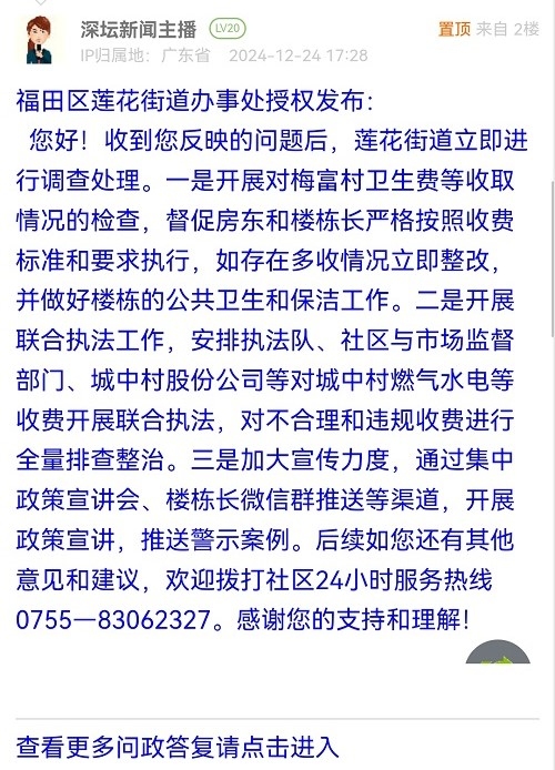 您好!收到您反映的问题后,莲花街道立即进行调查处理。一是开展对梅富村卫生费等收取情况的检查,督促房东和楼栋长严格按照收费标准和要求执行,如存在多收情况立即整改,并做好楼栋的公共卫生和保洁工作。二是开展联合执法工作,安排执法队、社区与市场监督部门、城中村股份公司等对城中村燃气水电等收费开展联合执法,对不合理和违规收费进行全量排查整治。三是加大宣传力度,通过集中政策宣讲会、楼栋长微信群推送等渠道,开展政策宣讲,推送警示案例。后续如您还有其他意见和建议,欢迎拨打社区24小时服务热线0755—83062327。感谢您的支持和理解!