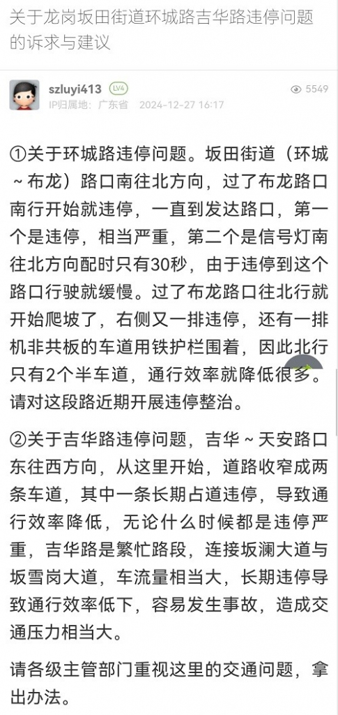 15. 帖文《关于龙岗坂田街道环城路吉华路违停问题的诉求与建议》