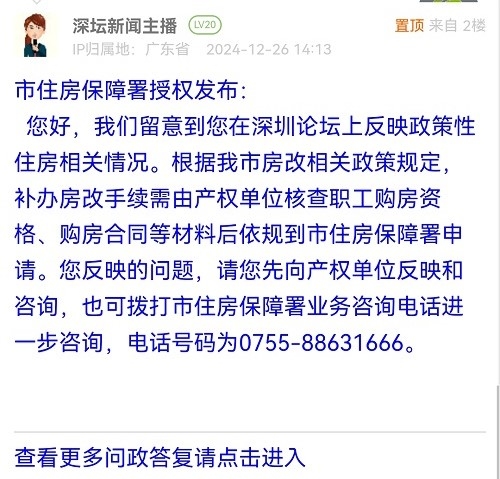 您好,我们留意到您在深圳论坛上反映政策性住房相关情况。根据我市房改相关政策规定,补办房改手续需由产权单位核查职工购房资格、购房合同等材料后依规到市住房保障署申请。您反映的问题,请您先向产权单位反映和咨询,也可拨打市住房保障署业务咨询电话进一步咨询,电话号码为0755-88631666。