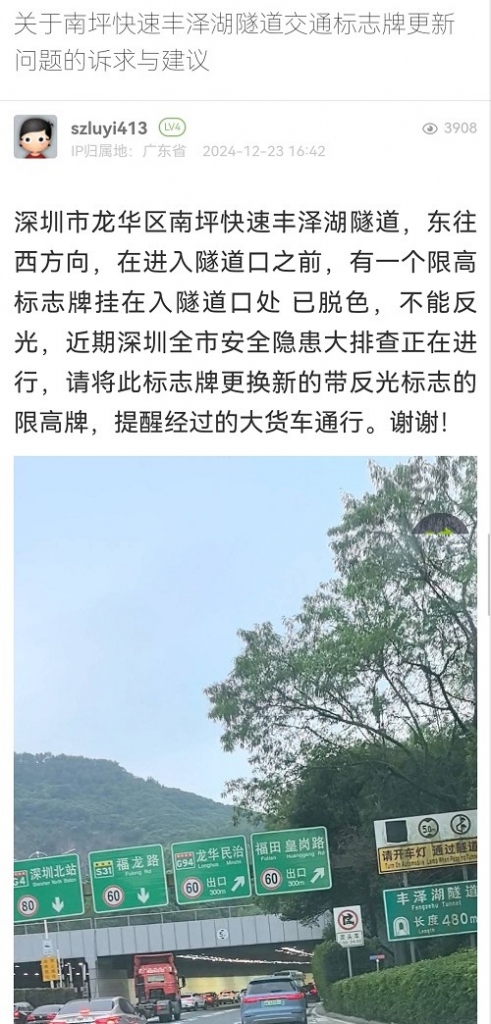 20. 帖文《关于南坪快速丰泽湖隧道交通标志牌更新问题的诉求与建议》